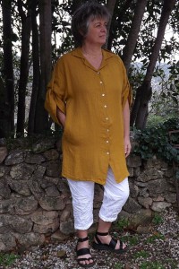 Liquette longue en lin de couleur safran. Manches larges avec une longue patte pour remonter la manche. 2 poches sur les cotés.