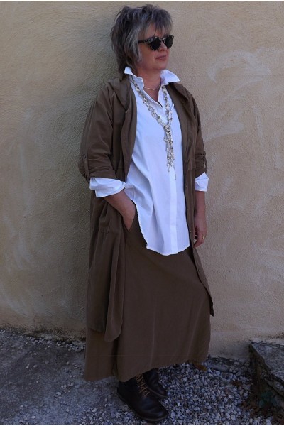 Veste longue velours milleraies avec capuche. Fermeture par boutons métal, 2 poches, fente en bas de chaque coté.