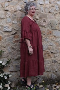Robe longue en lin grande taille de couleur bigarreau. Col V, les 3/4 sont bordées par des fronces et un cordon.