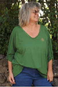 T-Shirt manches longues grande taille de couleur batavia avec petit imprimé soleil doré. Col V en finition brut.