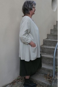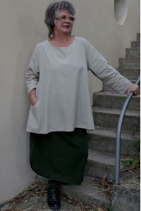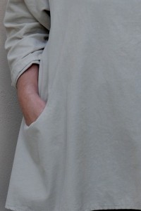 Top en velours over size beige, col rond, forme légèrement trapèze, deux poches pratiques.